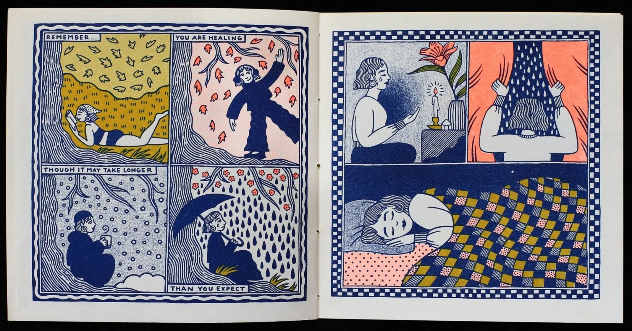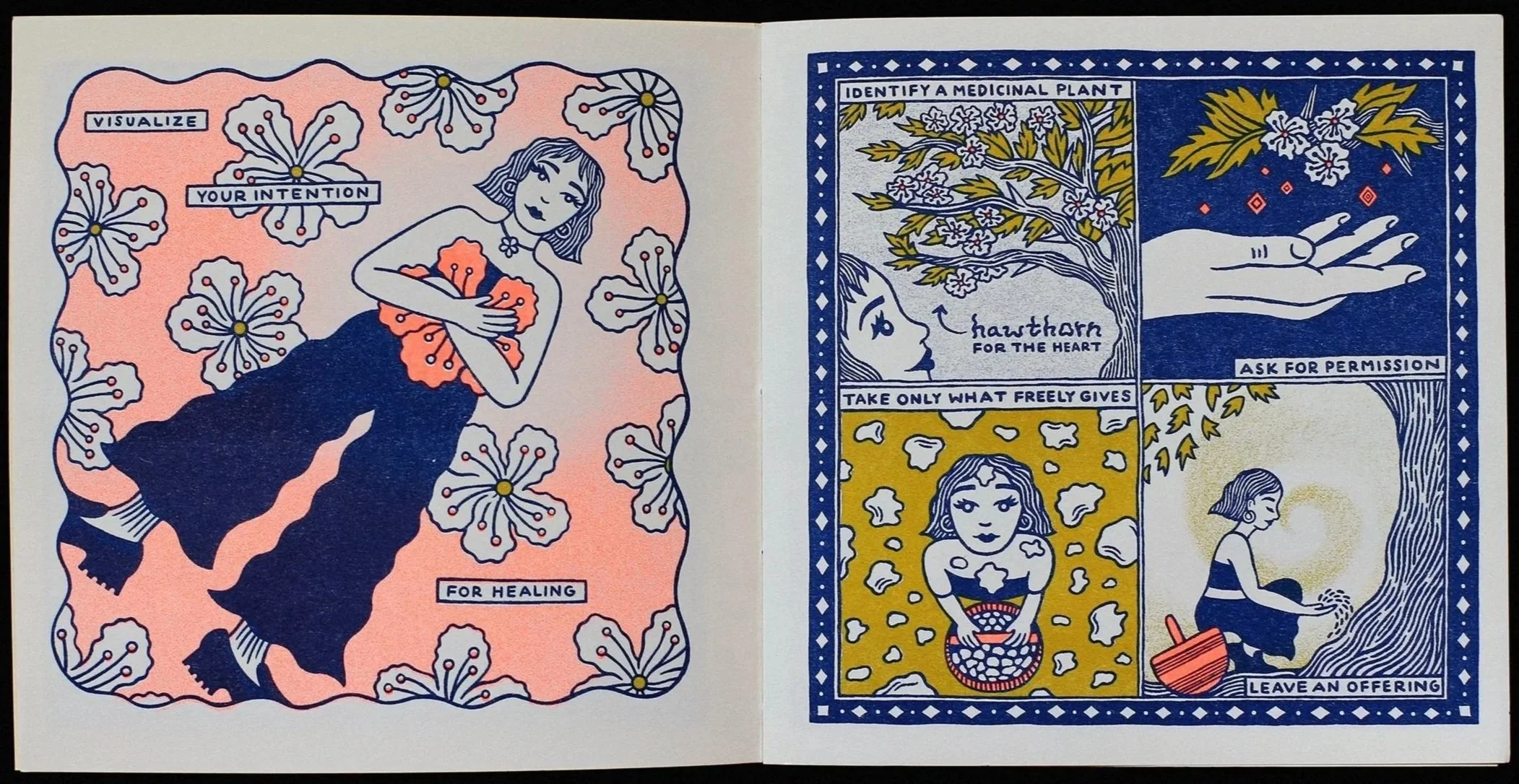 Honey and Vinegar is a 12-page risograph comic that poetically illustrates how to make an herbal medicine elixir with hawthorn blossoms, honey, and vinegar to overcome heartbreak and open to love. Drawn with brush and ink. Printed and sewn-bound by the artist at Riso Lab in New York City. First edition, 2024.